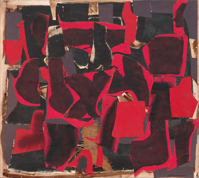 In 1952, Marca-Relli visited Mexico where the effects of sunlight on adobe brick buildings had a profound impact on the development of his work. During a period of experimentation, from his rented studio in San Miguel de Allende, he discovered collage. 1 Art historian William Agee wrote, “Marca-Relli’s achievement has been to raise collage to a scale and complexity equal to that of monumental painting. Since its inception in 1912 by Picasso and Braque, collage has undergone many formal transformations, yet it has remained a corollary to painting…Marca-Relli…developed it as a complete pictorial system essentially without precedent in modern art.”2Beginning with a rough sketch on bare canvas, he pinned segments of raw canvas cut by a razor onto a supporting canvas coated with a mixture of paint and glue, often shifting the collage sections to alter the formal relationships within the composition.