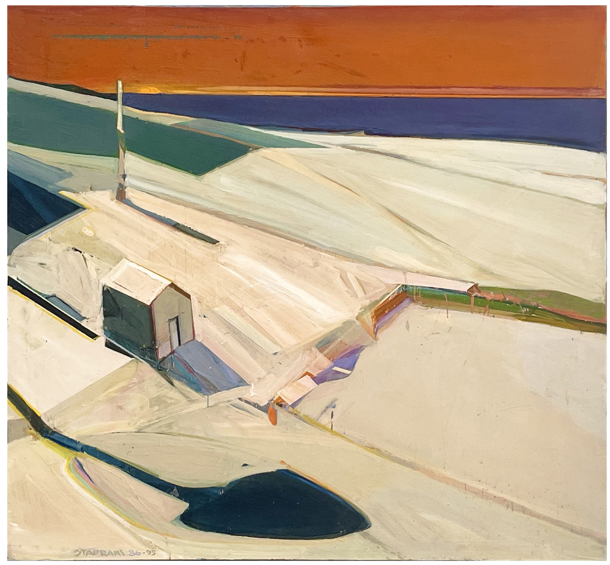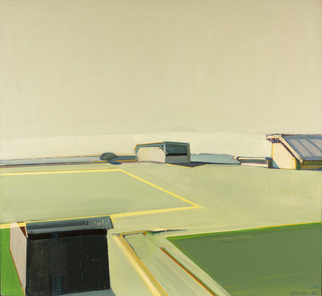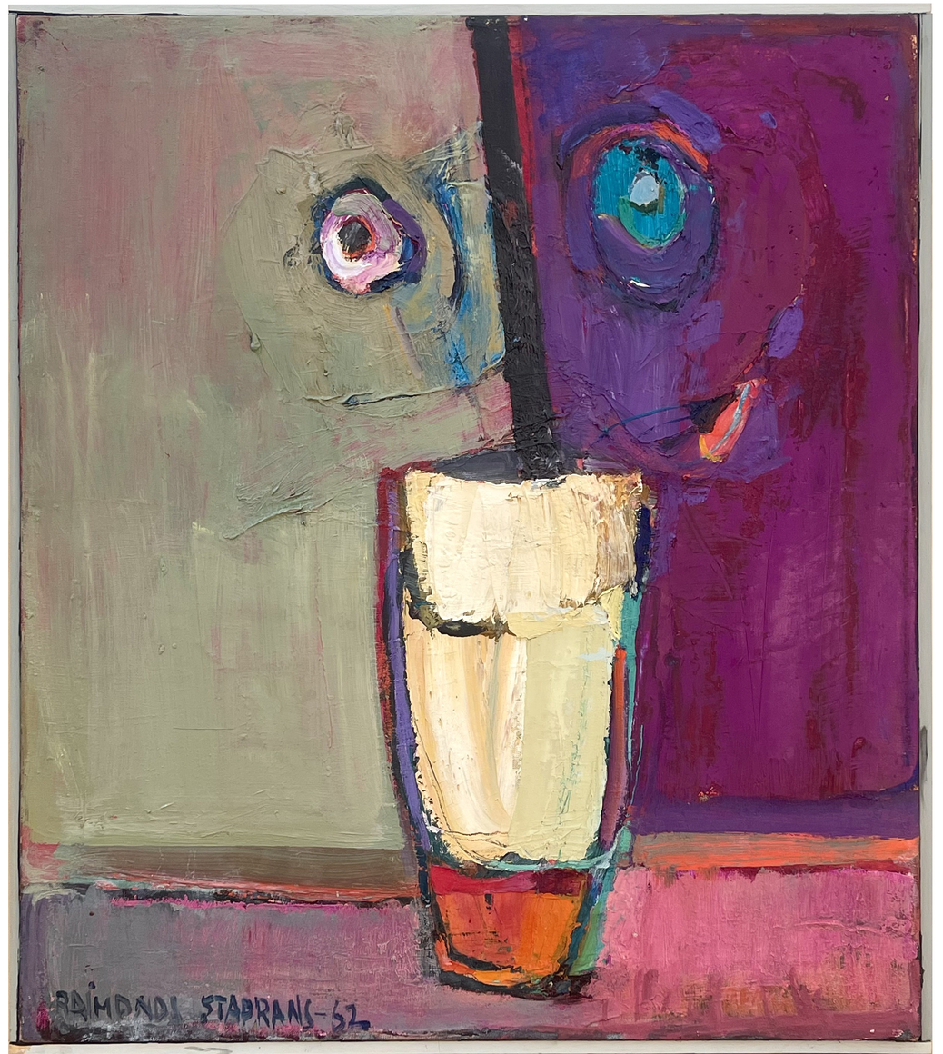 Raimonds Staprans is a painter whose still life and landscape compositions explore color and form by examining the geometry or ‘architecture’ of everyday objects—chairs, tables, fruit, anonymous buildings—and subverting their inherent naturalism via vibrant color and flattened compositions. Staprans’ attention to formalist values creates a tension between representation and abstraction that plays with viewers' expectations. Staprans, like Richard Diebenkorn, views subject matter as an integral component in exploring the formal devices of Abstract Expressionism while depicting a recognizable image.